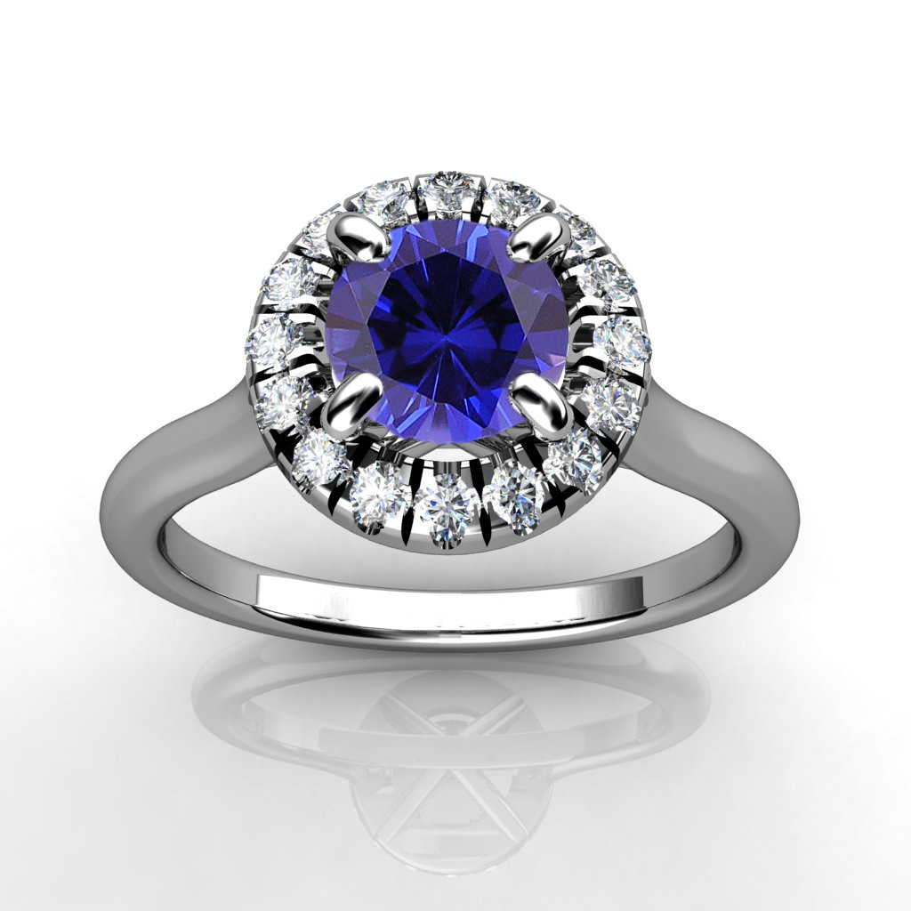 This gorgoues diamond engagement ring features a 5.5MM Round Sapphire beutifully accented by 12 sparkling white diamonds. Set in 14k White Gold 4-prong Halo Setting.