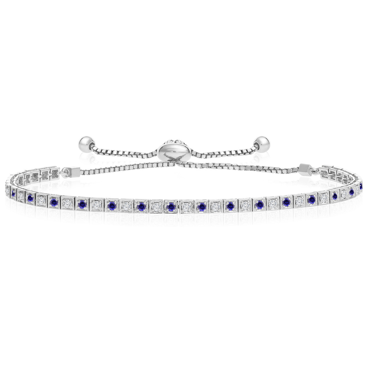 - "One-Size-Fits-All" Round Sapphire and Diamond Adjustable 'Box' Tennis Bracelet in 14k White Gold (.88ctw)