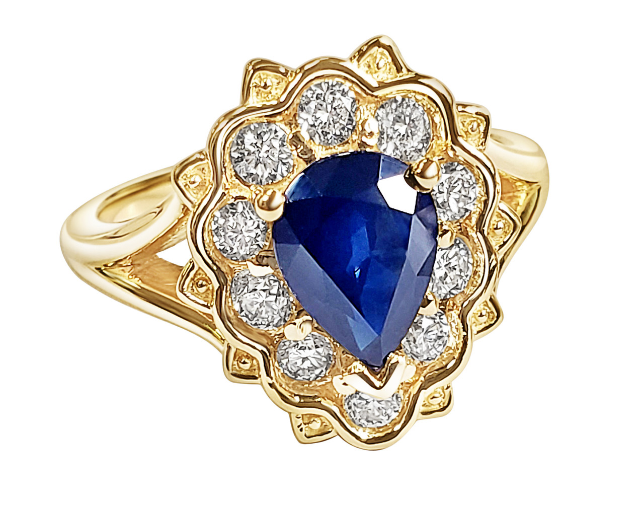 BEAUTIFUL 1.35CT PEAR SHAP SAPPHIRE SET WITH 10 LAB GROWN DIAMONDS TOTAL 1/2CT SET IN 14K YELLOW GOLD