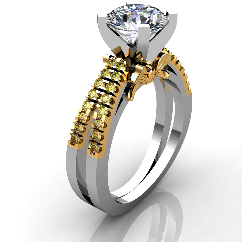 This gorgoues semi mount ring features 32 natural yellow diamonds in a double row two-tone setting.