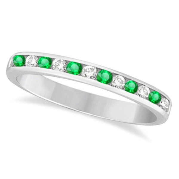 This beautiful 12-stone channel set ring features 6 Emerald gemstones alternating with 6 sparkling white diamonds. set in 14k White Gold. Available in 14k White and Yellow Gold.