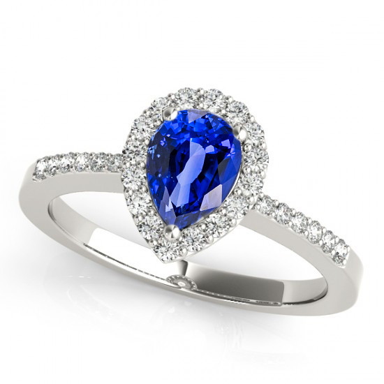 This stunning Pear Shaped engagement ring features 26 sparkling white diamonds around the 7x5mm Sapphire Gemstone. Set in 14k White Gold. Available in 14k White, Yellow, or Rose Gold.