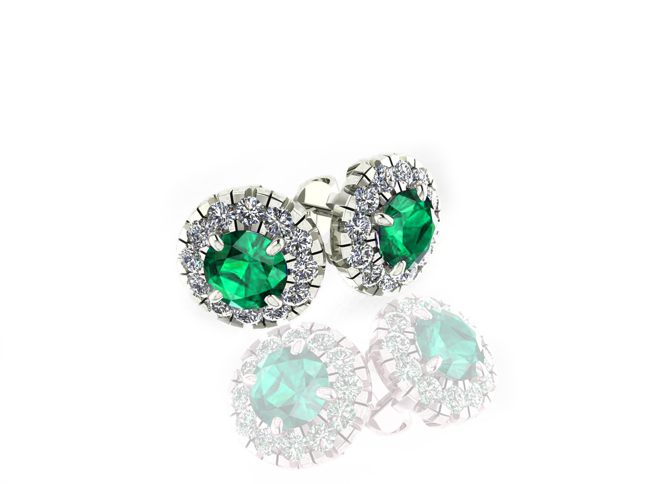 These gorgeous Emerald and Diamond earrings feature two round sapphires (2.00ctw) each surrounded with 13 sparkling white diamonds (.80ctw). Set in a 14k white gold Halo Setting.