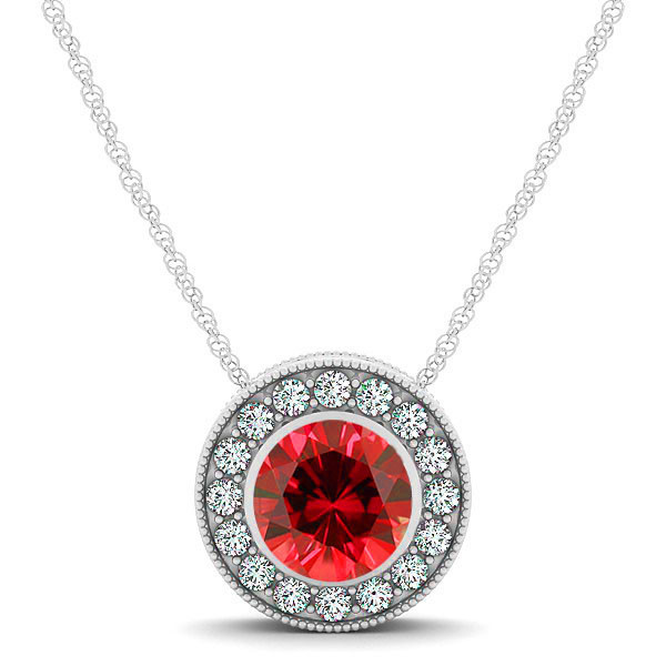 This beautiful diamond circle pendant features one 5mm round ruby gemstone surrounded by 14 sparkling white diamonds. Set in 14k White Gold. Available in 14k white, yellow, or rose gold.