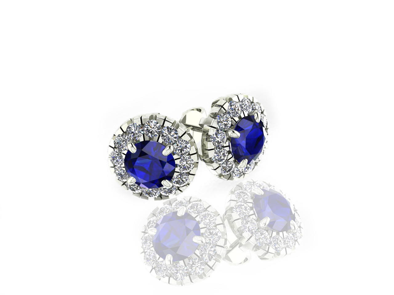 These gorgeous Sapphire and Diamond earrings feature two round sapphires (2.00ctw) each surrounded with 13 sparkling white diamonds (.80ctw). Set in a 14k white gold Halo Setting.