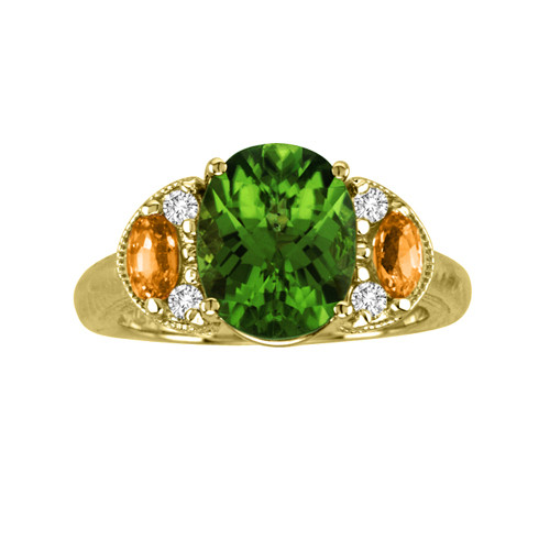 This stunning ring from our Kaleidoscope Collection features 1 Peridot gemstone (2.50ct) along with 2 Yellow Sapphires (.50ct t.w) on both sides with 4 white diamonds (.24ct). Set in 14k Yellow Gold