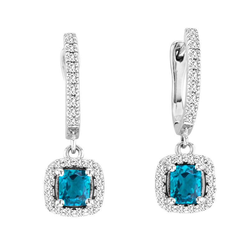 These gorgeous pair of gemstone earrings feature two 5X5mm Cushion-Cut Blue Topaz gemstones along with 52 sparkling white diamonds set in 14k White Gold Setting.