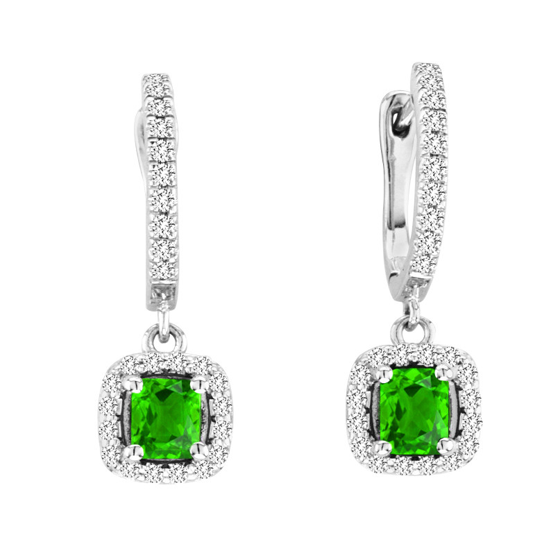These gorgeous pair of gemstone earrings feature two 5X5mm Cushion-Cut Peridot gemstones along with 52 sparkling white diamonds set in 14k White Gold Setting.