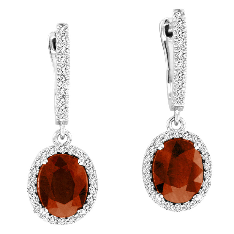 These stunning gemstone earrings feature two 9X7mm Oval Garnet Gemstones accented by 64 sparkling white diamonds. Set in 14k White Gold. Available in 14k White, Yellow, or Rose Gold.