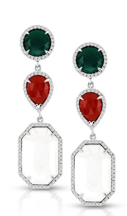 This beatiful set of earrings from our "ILANO Collection" features 1 red agate, 1 green agate , and 1 white agate to present the perfect fashion look. Each agate is complimented with diamonds surrounding it for a total of 190 Diamonds. Set in 14k White Gold